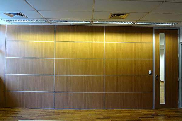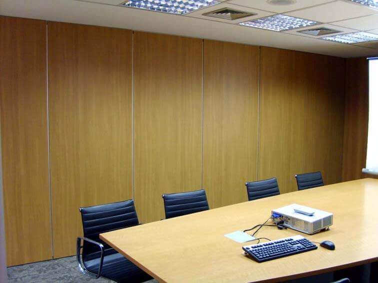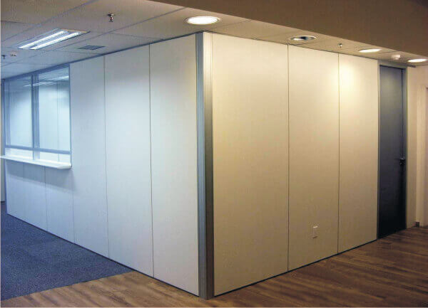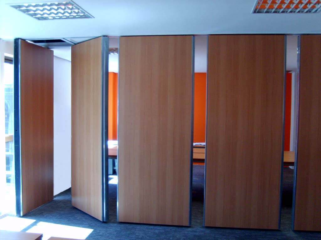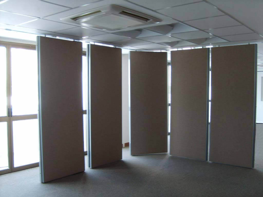 Sistema formado por módulos independentes com a junção tipo macho/fêmea, que deslizam em trilho aéreo com dois canais independentes de rolagem utilizando roldanas compostas de rolamentos blindados e auto lubrificantes revestidos com capa de nylon de alta resistência. Módulos dotados de estrutura em aço contraplacados com chapas de madeiras industrializada e interior composto de material com propriedades de acústica e isolação sonora.